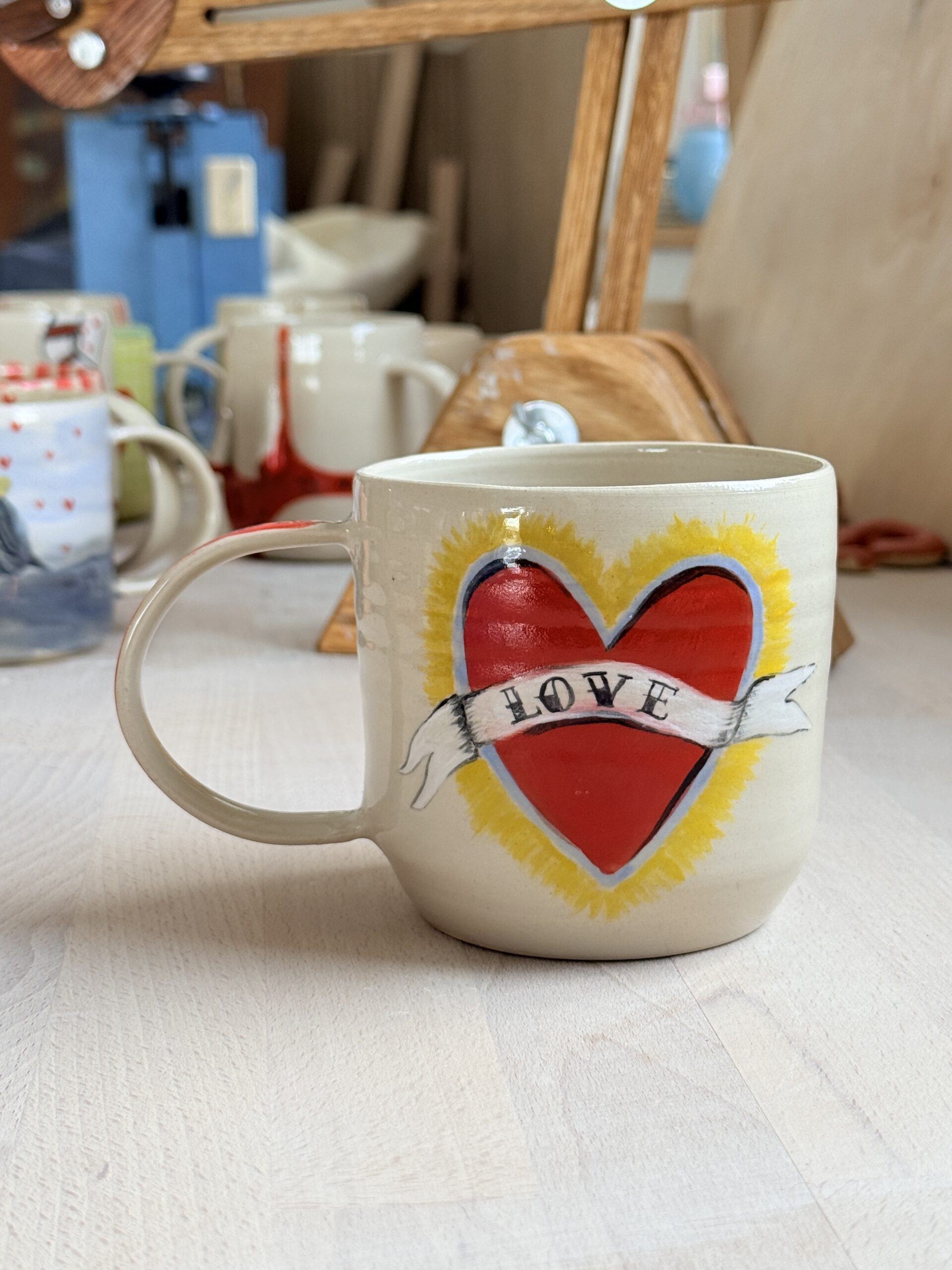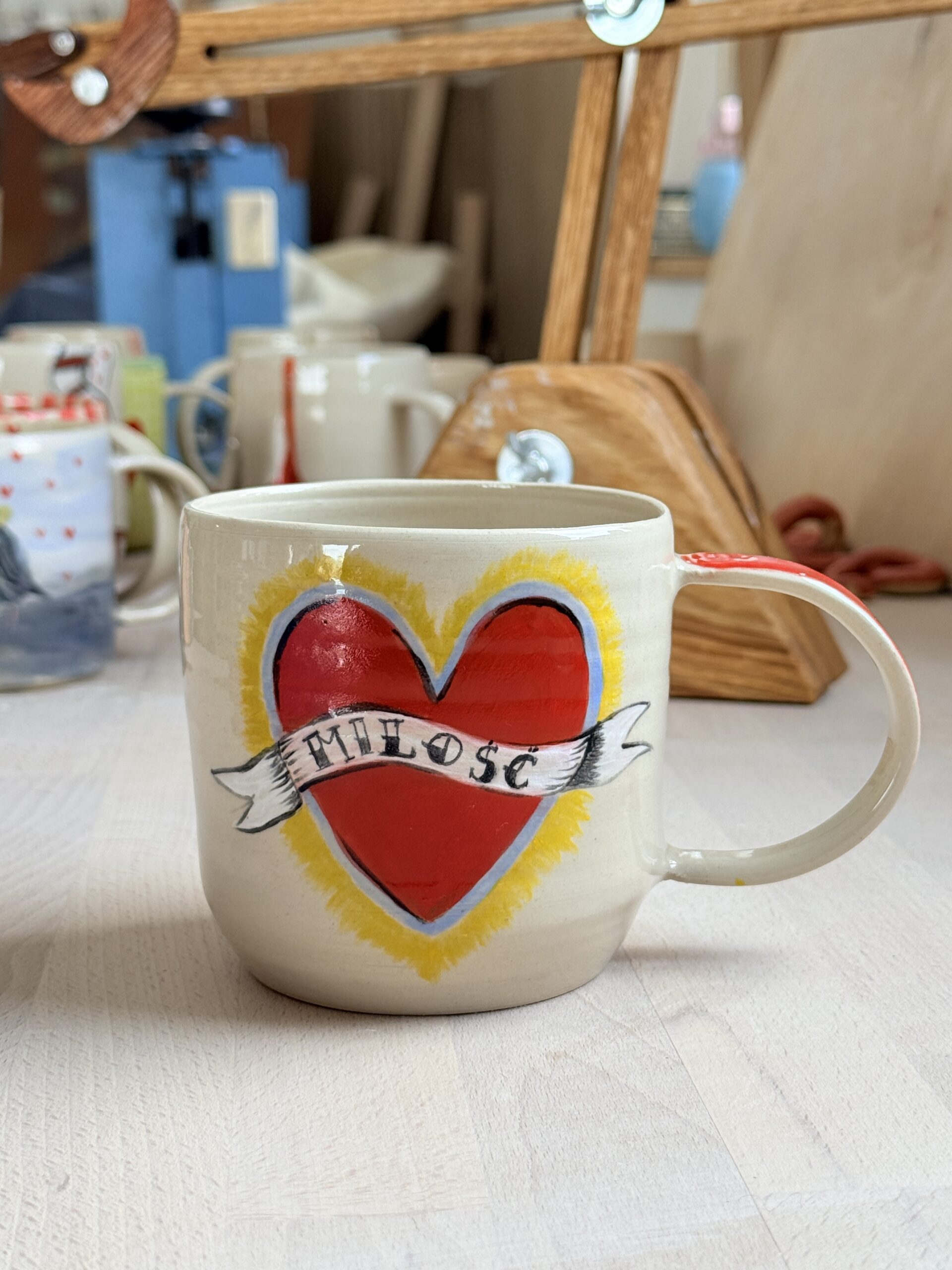 Kubek wytoczony na kole,z malowaniem inspirowanym tatuażami oraz sercami pochodzącymi z Meksyku .Corazones de Milagritos to dosłownie serca małych cudów .symbole wiary miłości oraz są prośbami o pomyślność bądź wyrazem wdzięczności.