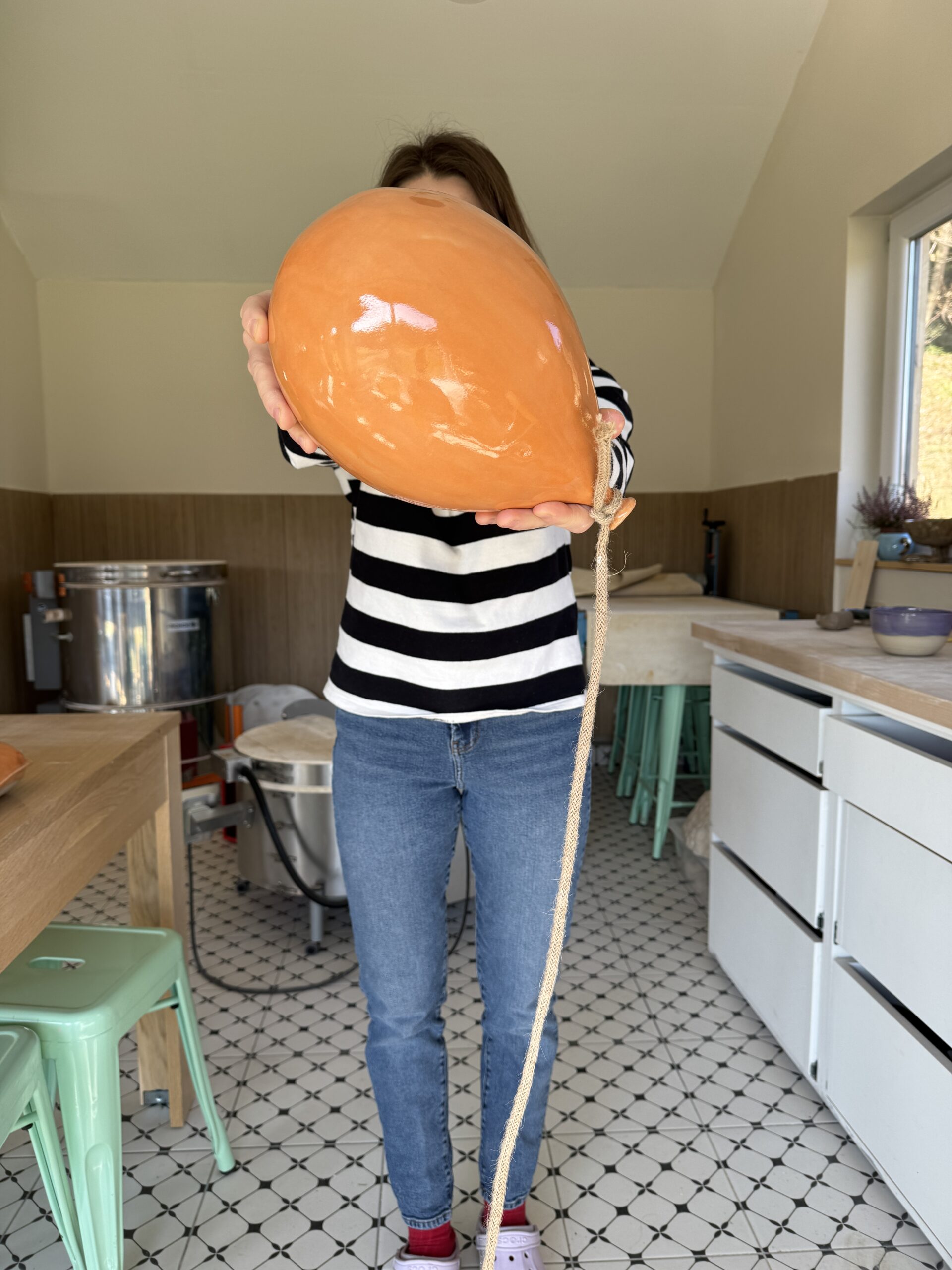 Balon ceramiczny w kolorze pomarańczowym ,gotowy do powieszenia w pokoju dziecięcym,biurze bądź innej powierzchni gdzie nada lekkości i niesztampowego uroku pomieszczeniu.